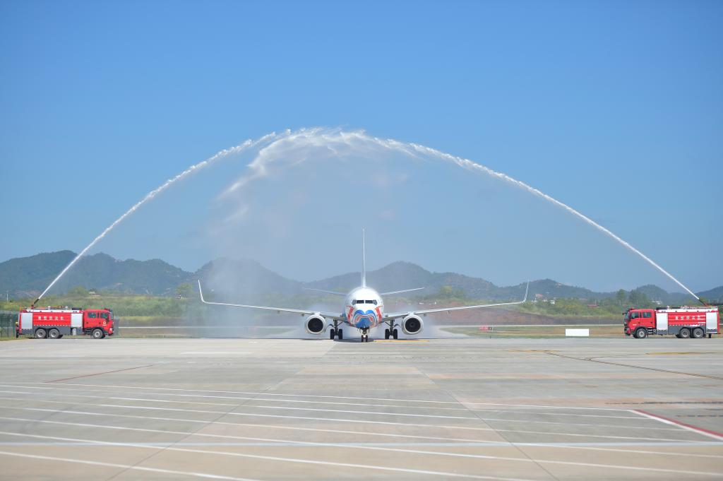 2025年9月28日,由中国国际航空执飞的北京大兴至瑞金航班飞抵瑞金机场后通过“水门”。新华社发(杨鑫 摄)